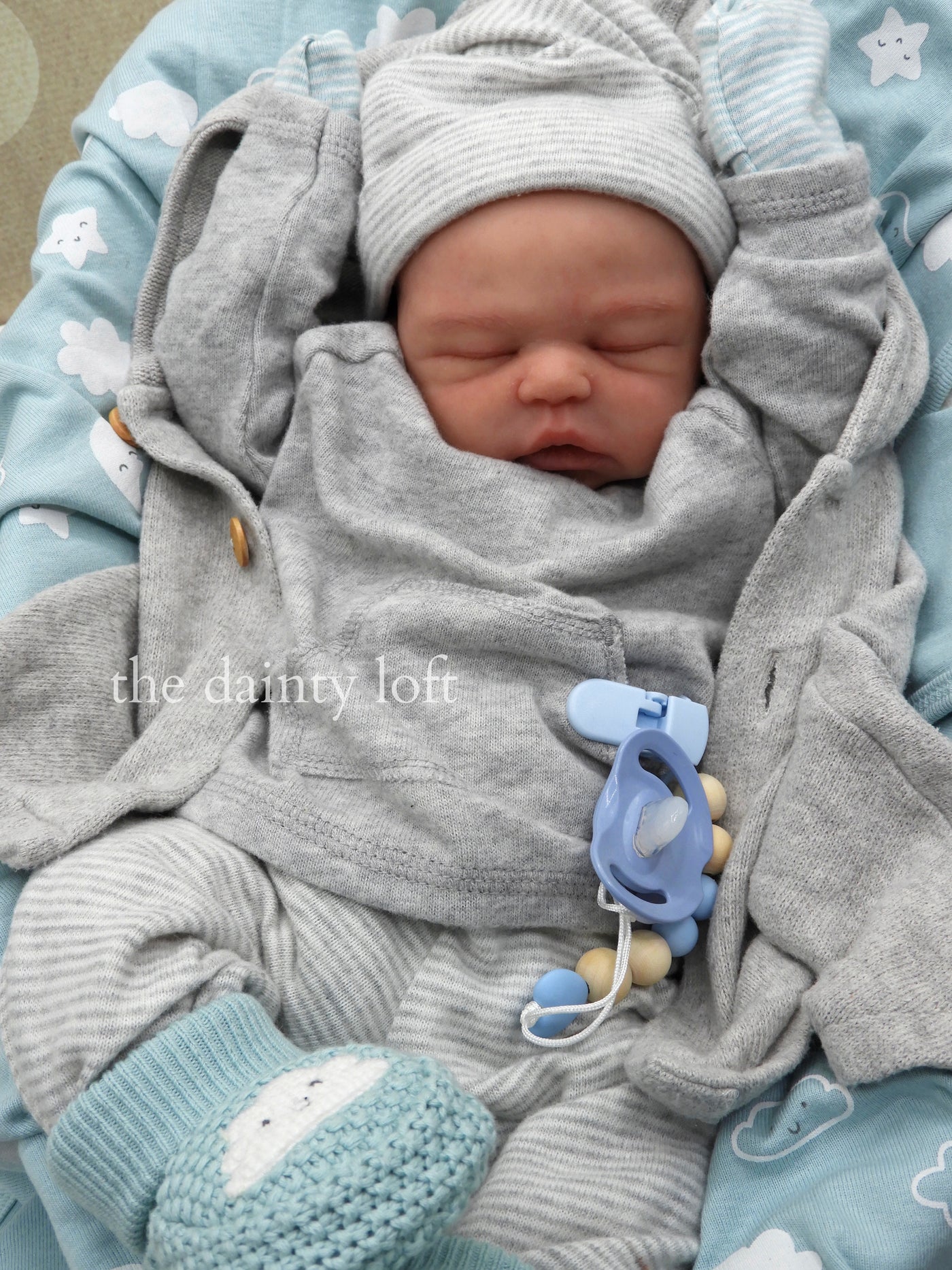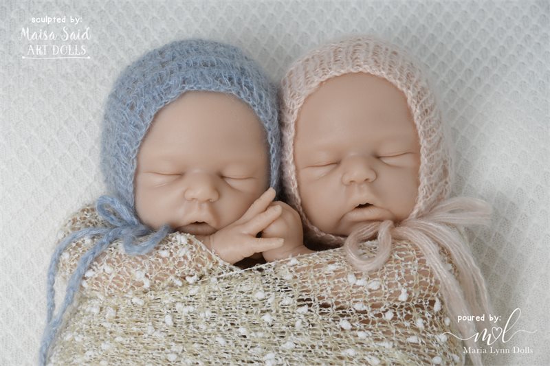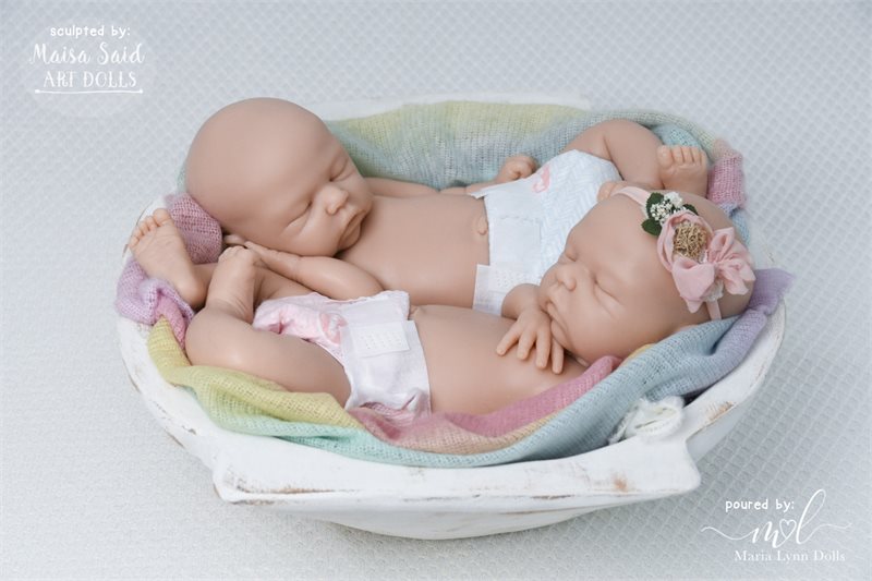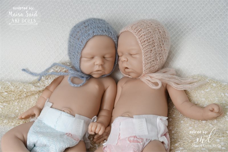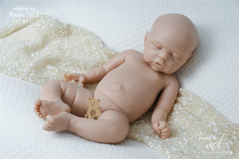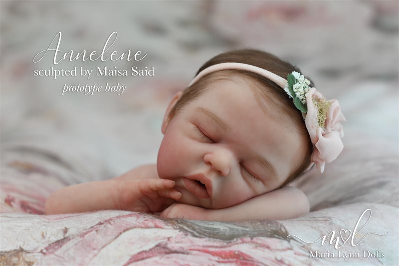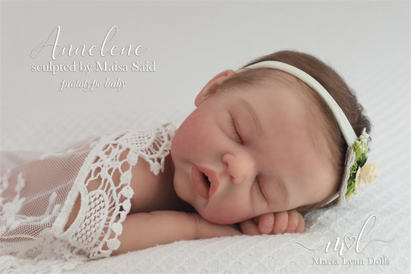Annelene Asleep is 17.5 inches long with bent knees, weighs 5lb 6oz, and is poured in one piece by Maria Lyyn Dolls. She has an open mouth with visible upper gums sculpted inside. She is also available as “Andrew”, the boy version of this kit.