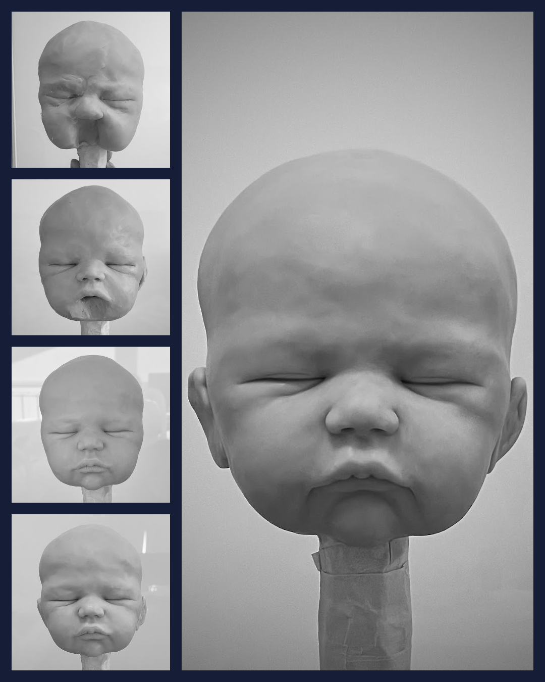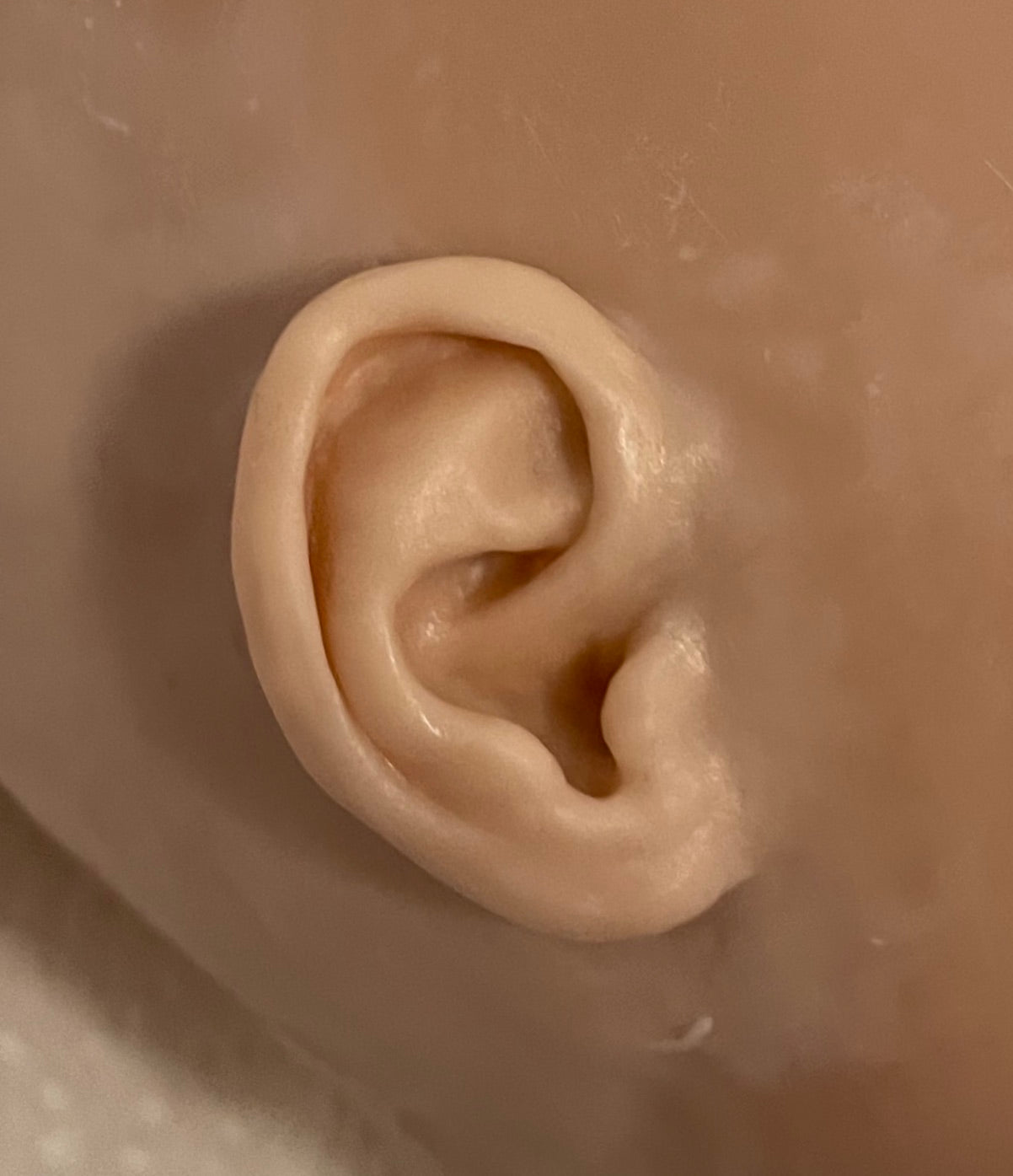 Below is a photo of a newly sculpted ear added to the cured head. After the final bake, the head is ready for sanding to smooth any lumpiness in the surface of the clay.
